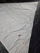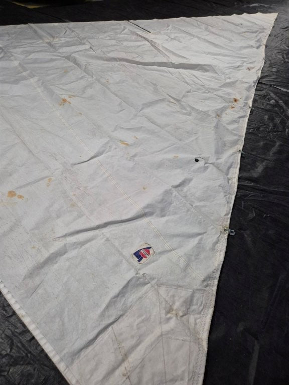 This Macdiarmid Sails Dacron Jib/Genoa is rated 5/10 so is in average condition. The sail is a low aspect jib with short battens. The top hank eyelet is missing. There are many rust stains. Battens provided (in sail). Blue/red/white round sail bag provided.
