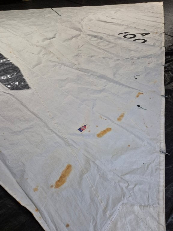 This Macdiarmid Sails Dacron Genoa is rated 6/10 so is in above average condition. The sail has some rust staining. Some bronze hanks are seized and require servicing. Red/white round sail bag provided.