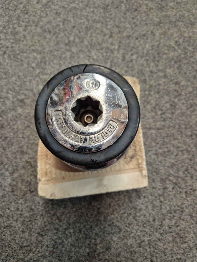 This Barlow 15 2 Speed Chrome Bronze self tailling Winch is rated 7/10 so is in good working condition. The winch is mounted on a section of deck.