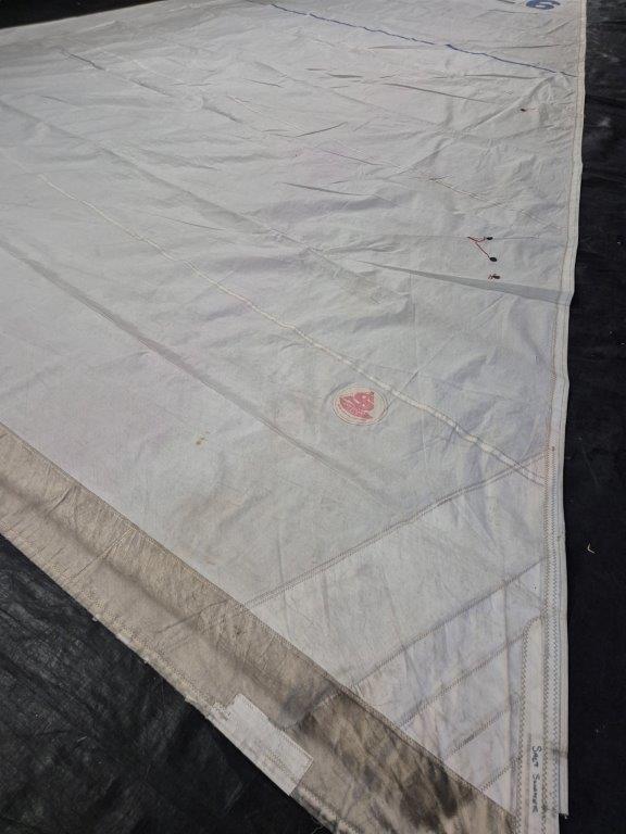This Ian Short Sails Dacron Roller Furling Genoa (RFG) is rated 5/10 so is in average condition. White UV suncover on starboard side. Blue round sail bag provided.