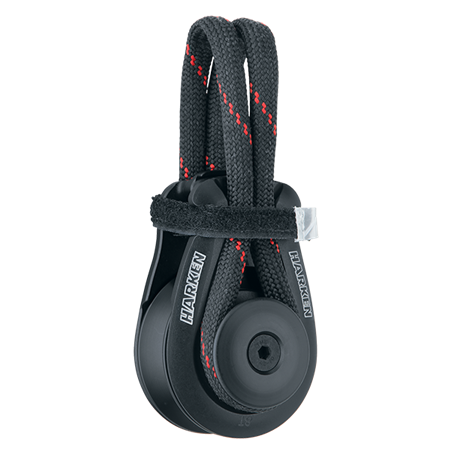 These multipurpose blocks are a must on racing yachts of all sizes. Opening sideplates make them easy to deploy, allowing crew to quickly fasten them wherever needed—perfect for temporary leads, line deflection, and static line functions requiring small adjustments. A strop soft-attach is fixed on one side, but is easily removable on the other. The strop carries the block’s primary load and articulates for a fair lead. The Velcro® strap is permanently attached to one sideplate and holds the block securely closed when sideplates are aligned—even under the highest loads. The strap has a broad reflective tab for easier operation with gloves.