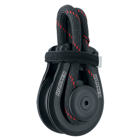 These multipurpose blocks are a must on racing yachts of all sizes. Opening sideplates make them easy to deploy, allowing crew to quickly fasten them wherever needed—perfect for temporary leads, line deflection, and static line functions requiring small adjustments. A strop soft-attach is fixed on one side, but is easily removable on the other. The strop carries the block’s primary load and articulates for a fair lead. The Velcro® strap is permanently attached to one sideplate and holds the block securely closed when sideplates are aligned—even under the highest loads. The strap has a broad reflective tab for easier operation with gloves.