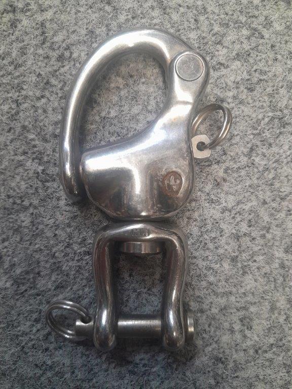 This Wichard Piston Snap Shackle is rated 4/10 so is in below average condition. The swivel is not functioning through 360 degrees. Clevis pin swivel (refer to photos).